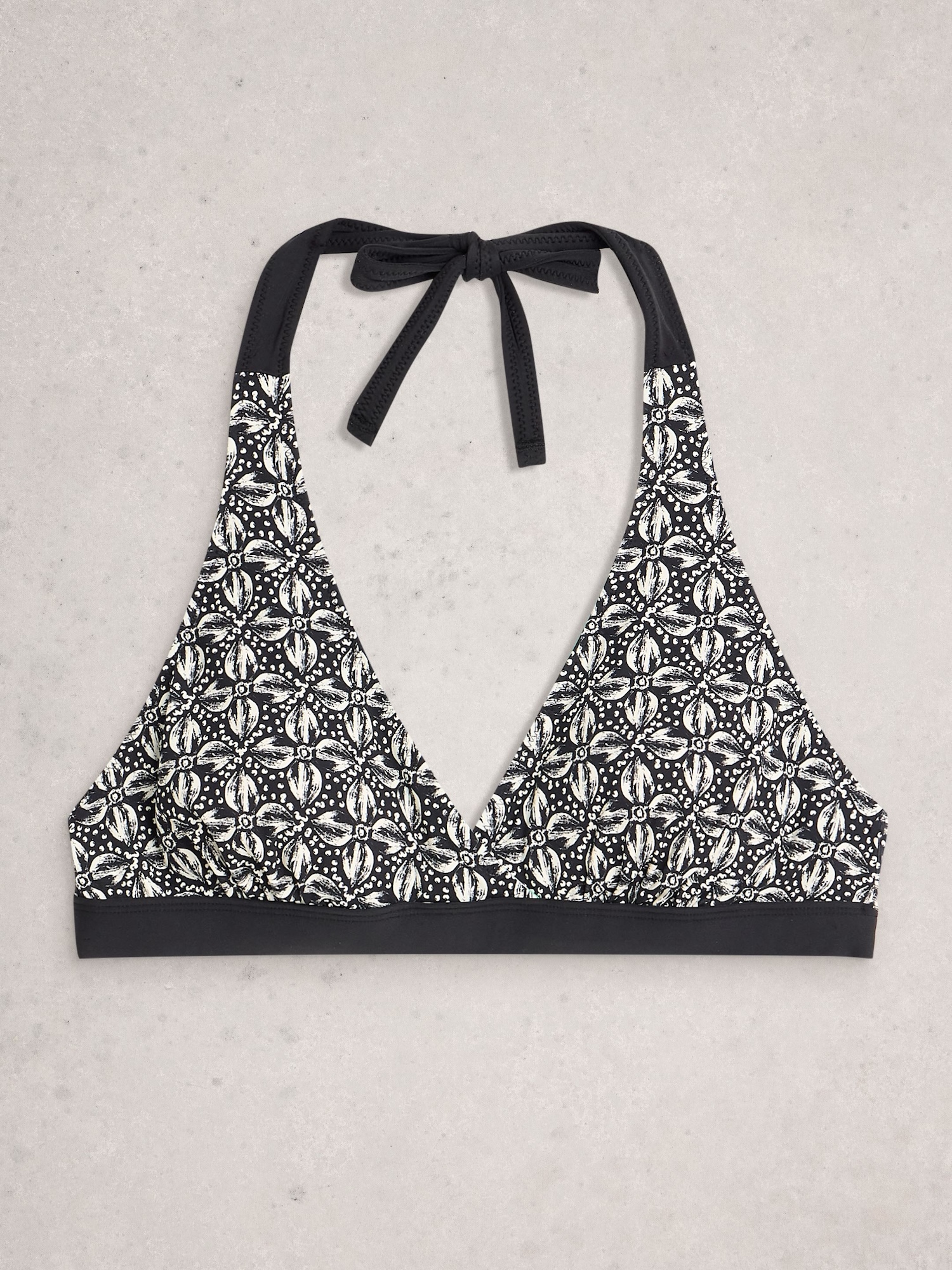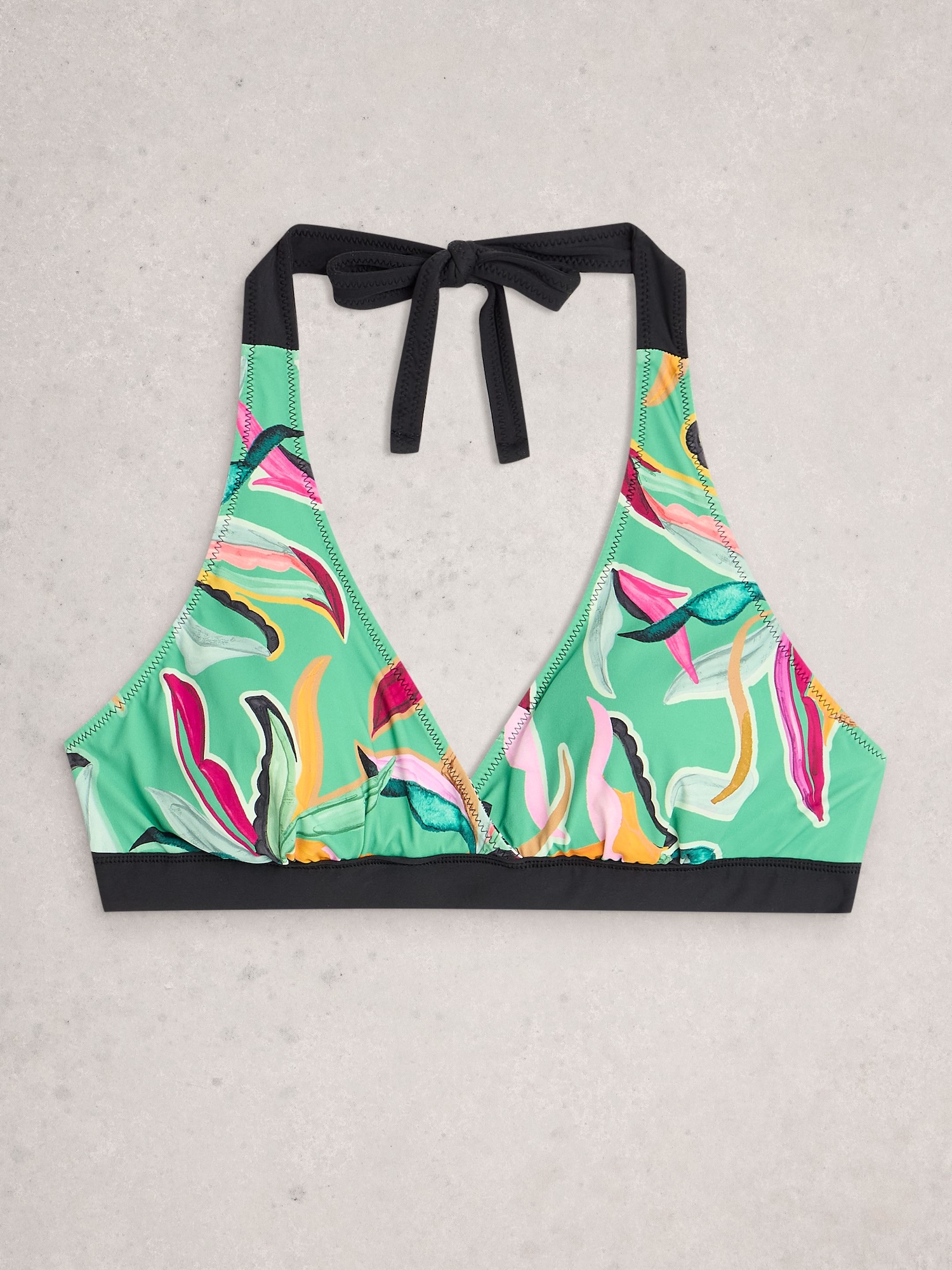 Das lebendige Grün mit Print zieht die Blicke auf sich, der tiefe V-Ausschnitt wirkt leicht und feminin. Am Nacken gebunden, lässt sich das Oberteil angenehm anpassen.