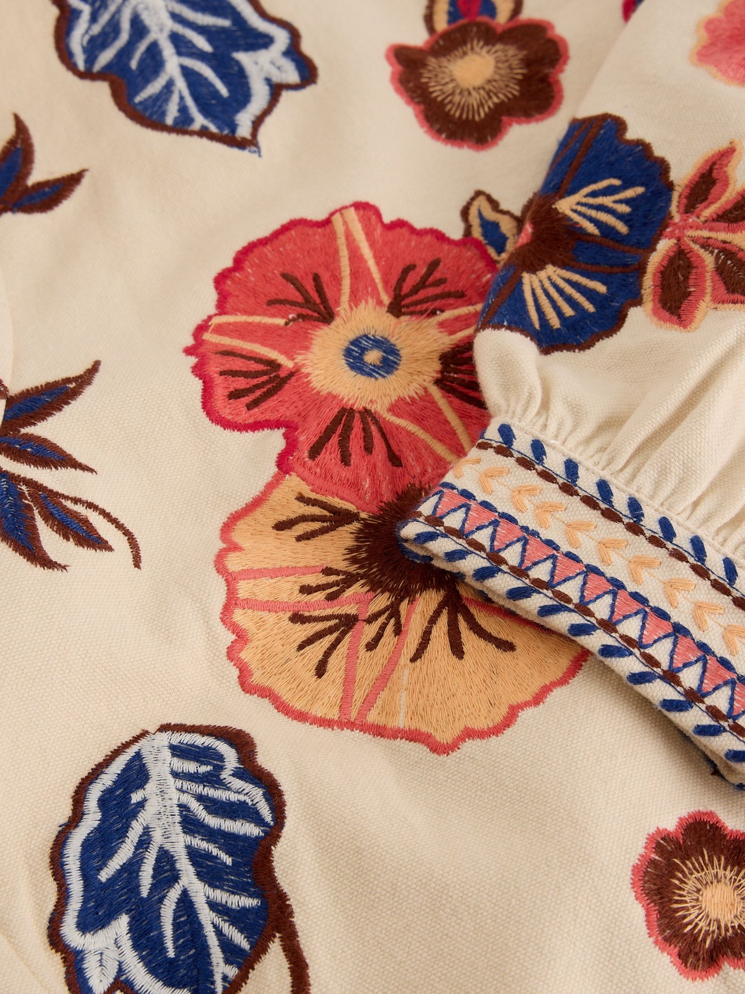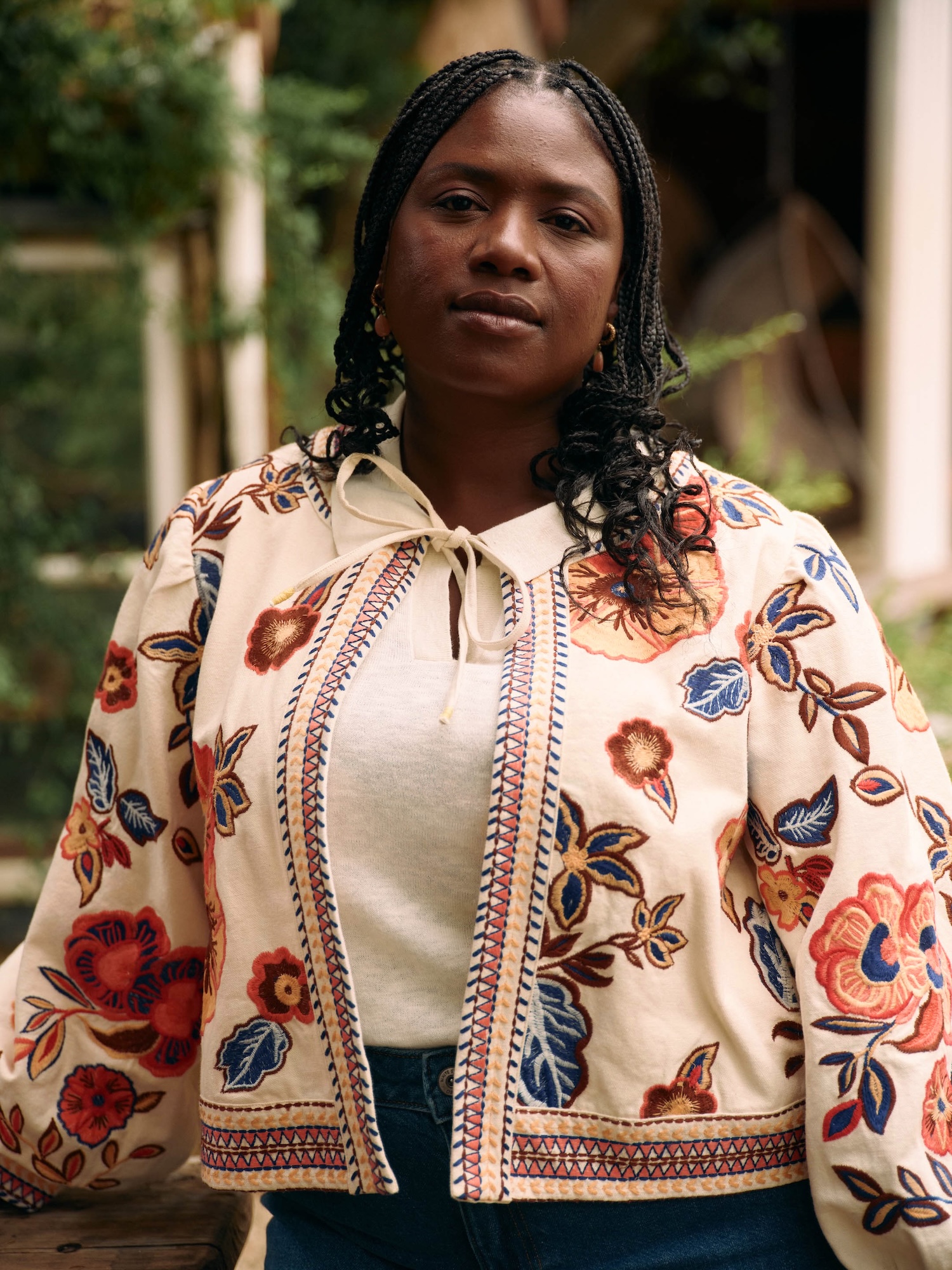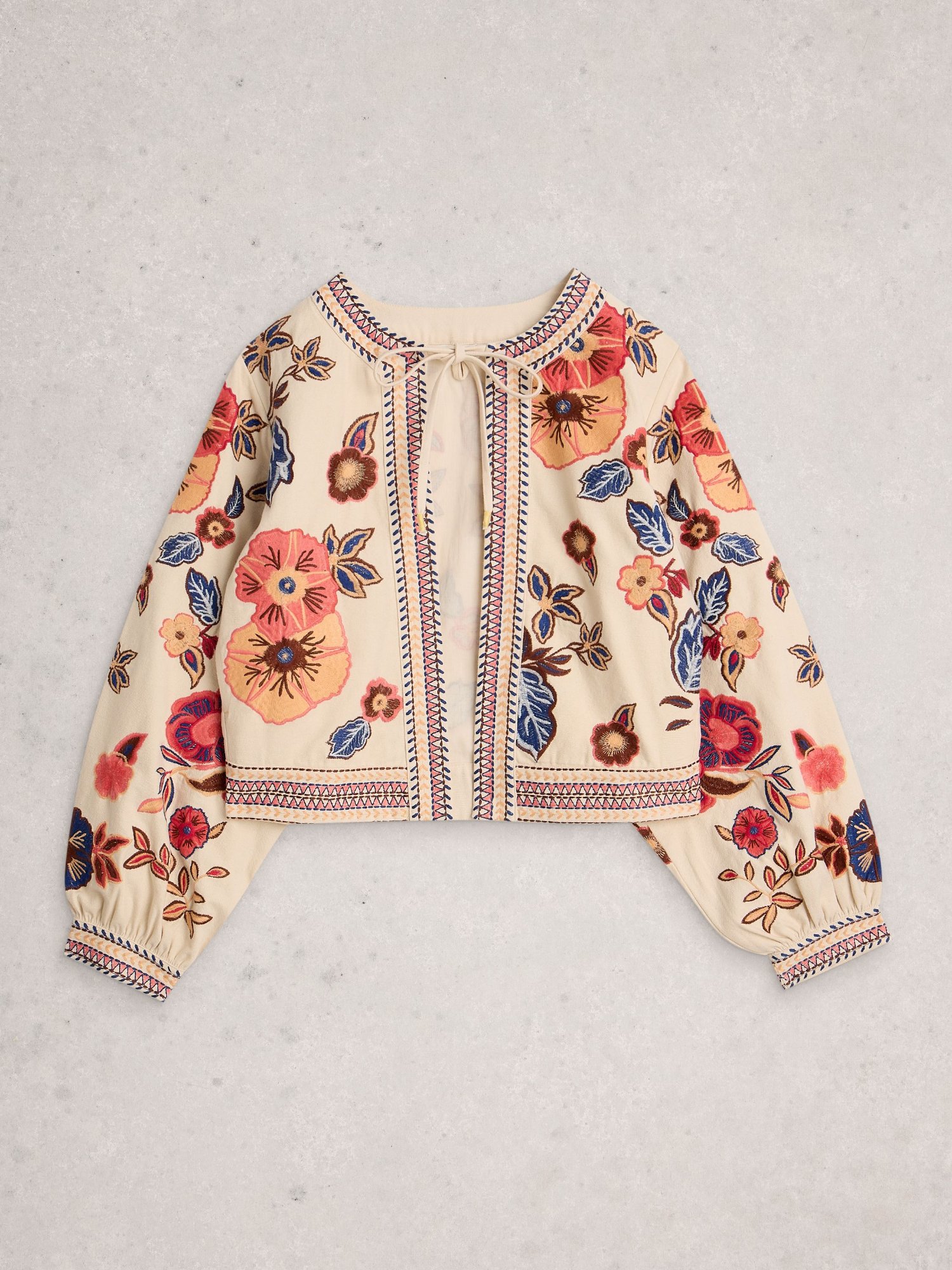 Kurze, bestickte Jacke, die jedem Look farbenfrohe Akzente verleiht. Das Futter sorgt für mehr Tragekomfort beim Tragen über leichten Pullovern.