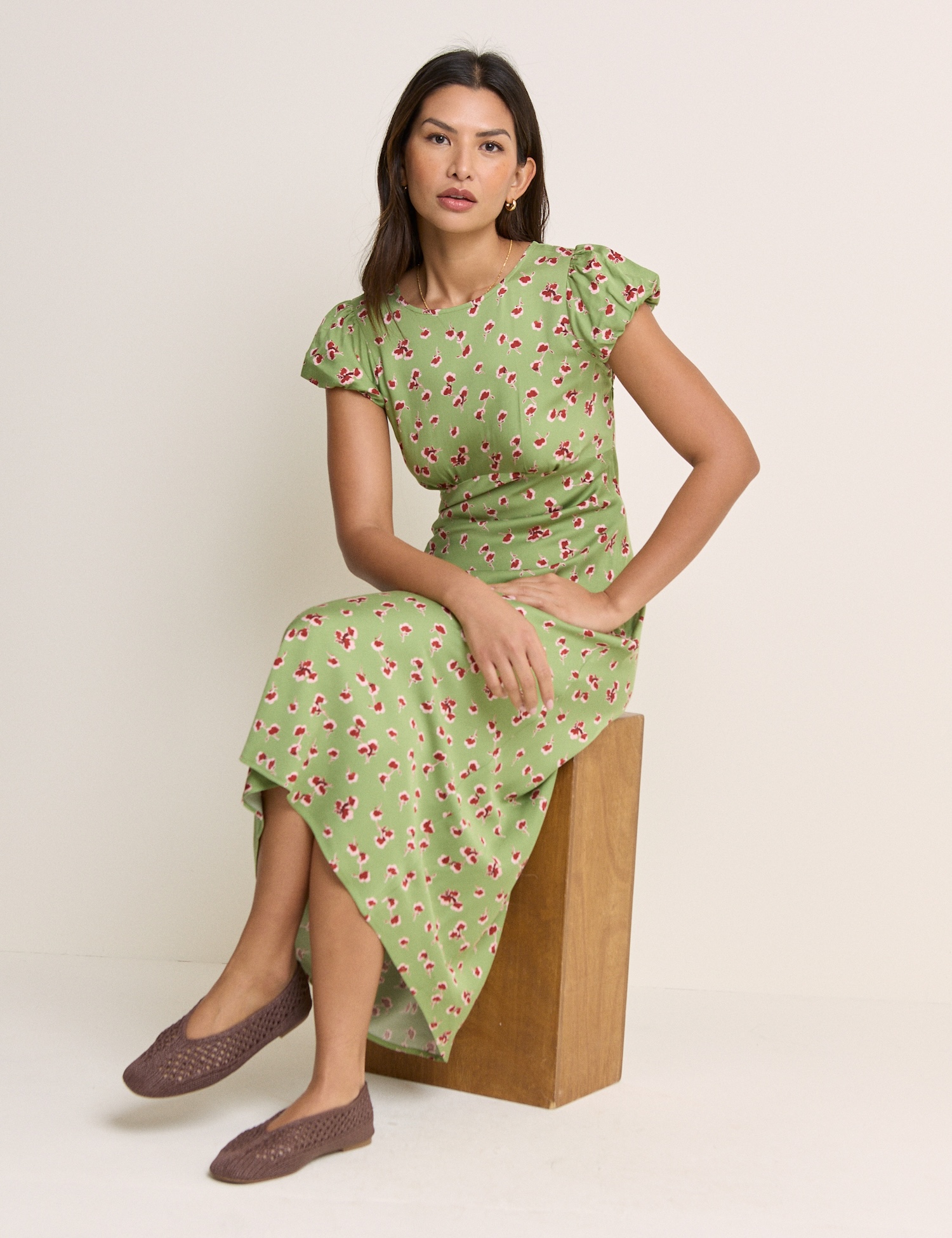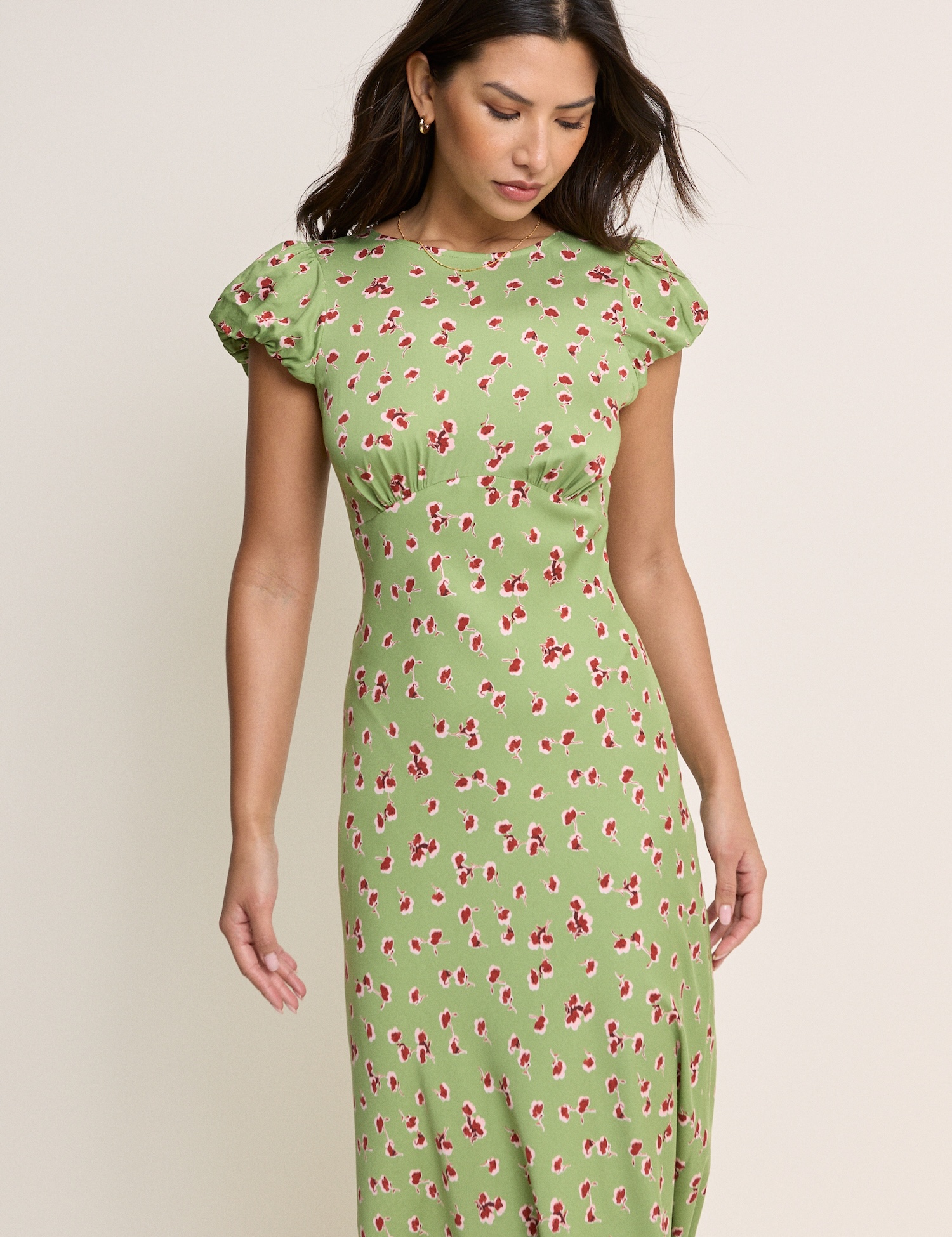 Das leichte Maxikleid im grünen Blumenprint wirkt frisch und gepflegt. Die klassische, taillierte Silhouette passt sowohl im Alltag als auch zu festlicheren Anlässen.