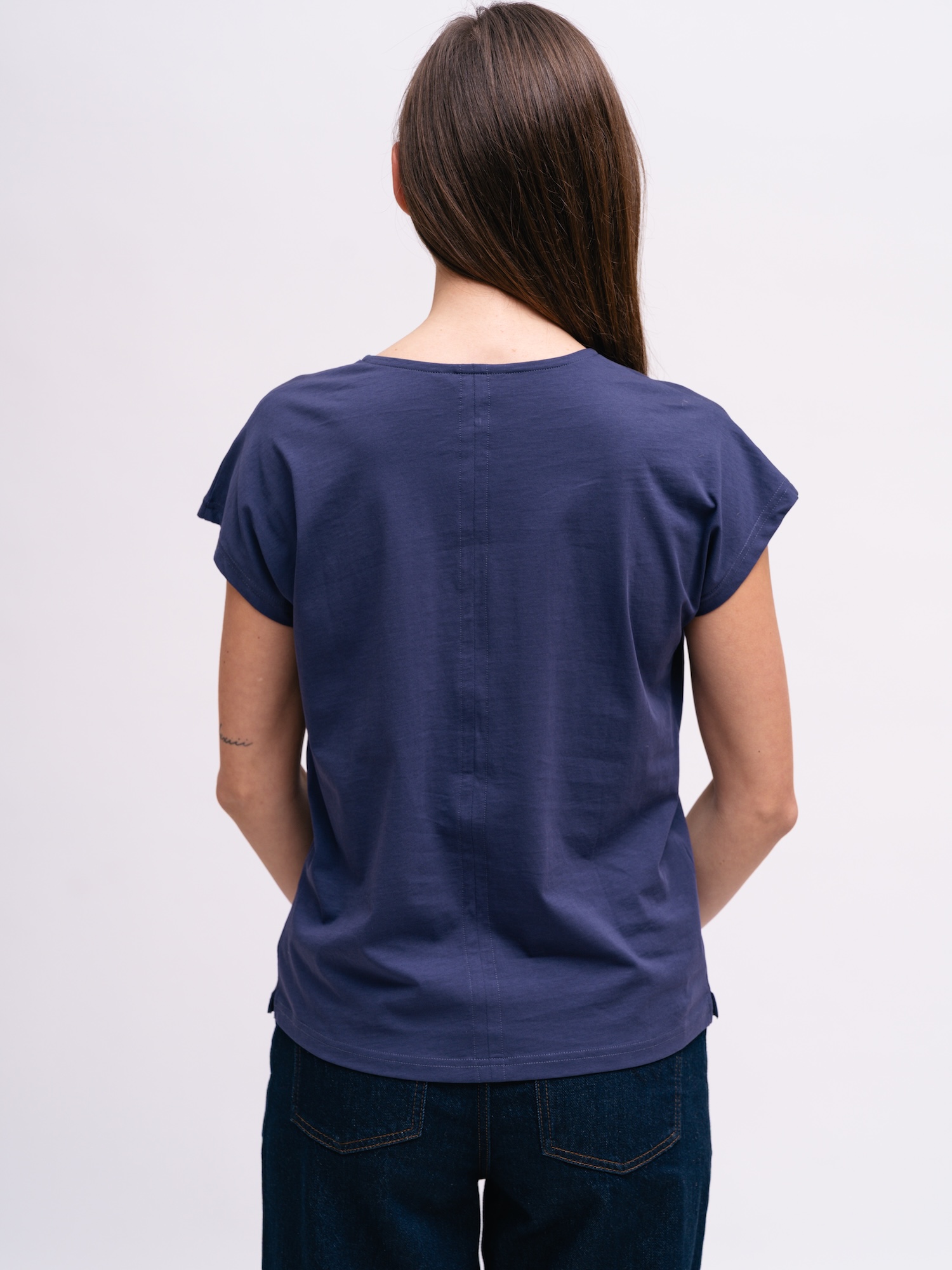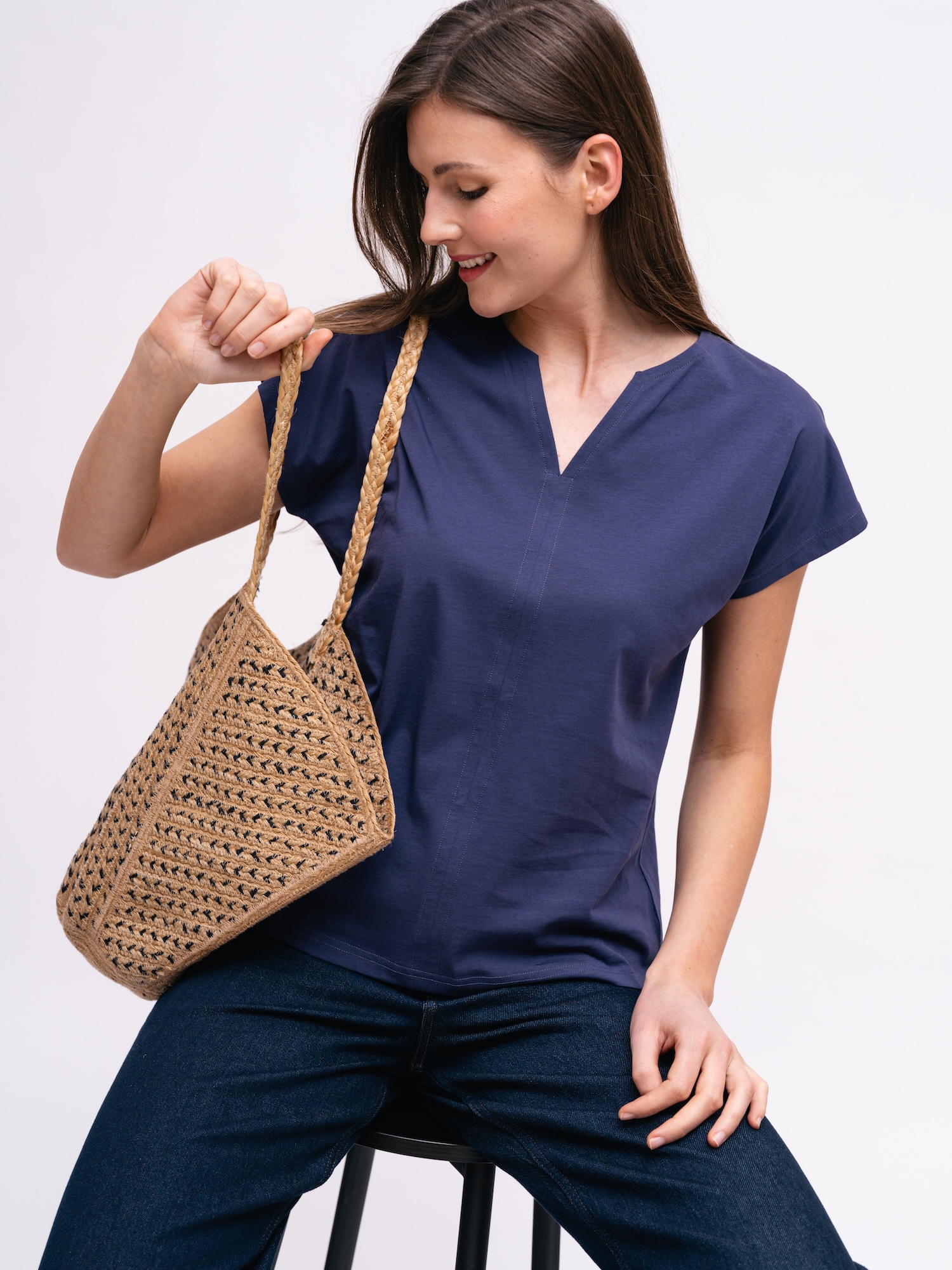 Das dunkelblaue Top verleiht Outfits eine ruhige, gepflegte Ausstrahlung. Gerader Schnitt und schlichter Ausschnitt eignen sich fürs Büro und für das Wochenende.