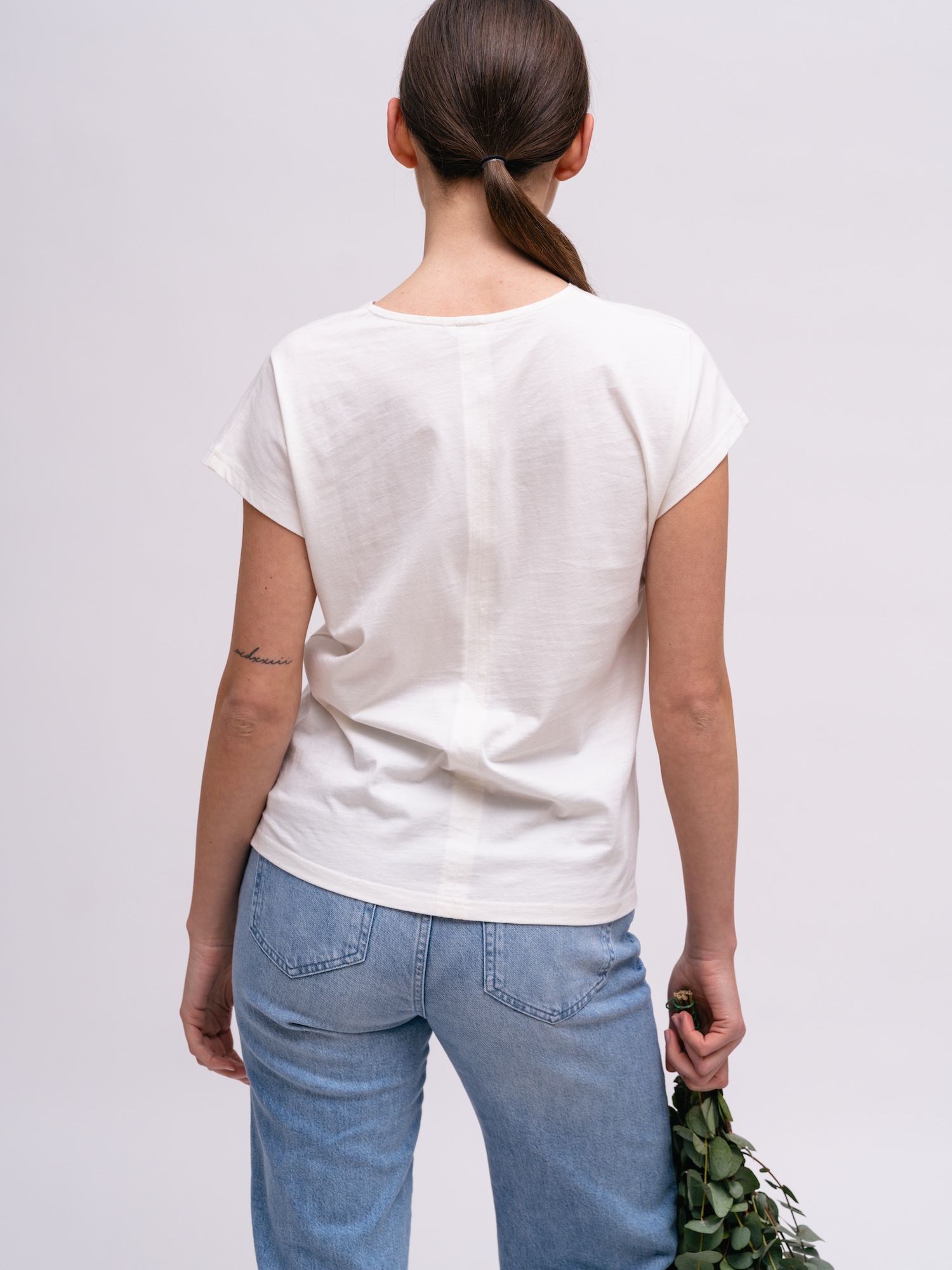 Weißes Top mit klaren Linien ist ein vielseitiges Basic. Der schlichte Schnitt eignet sich sowohl solo als auch im Layering.