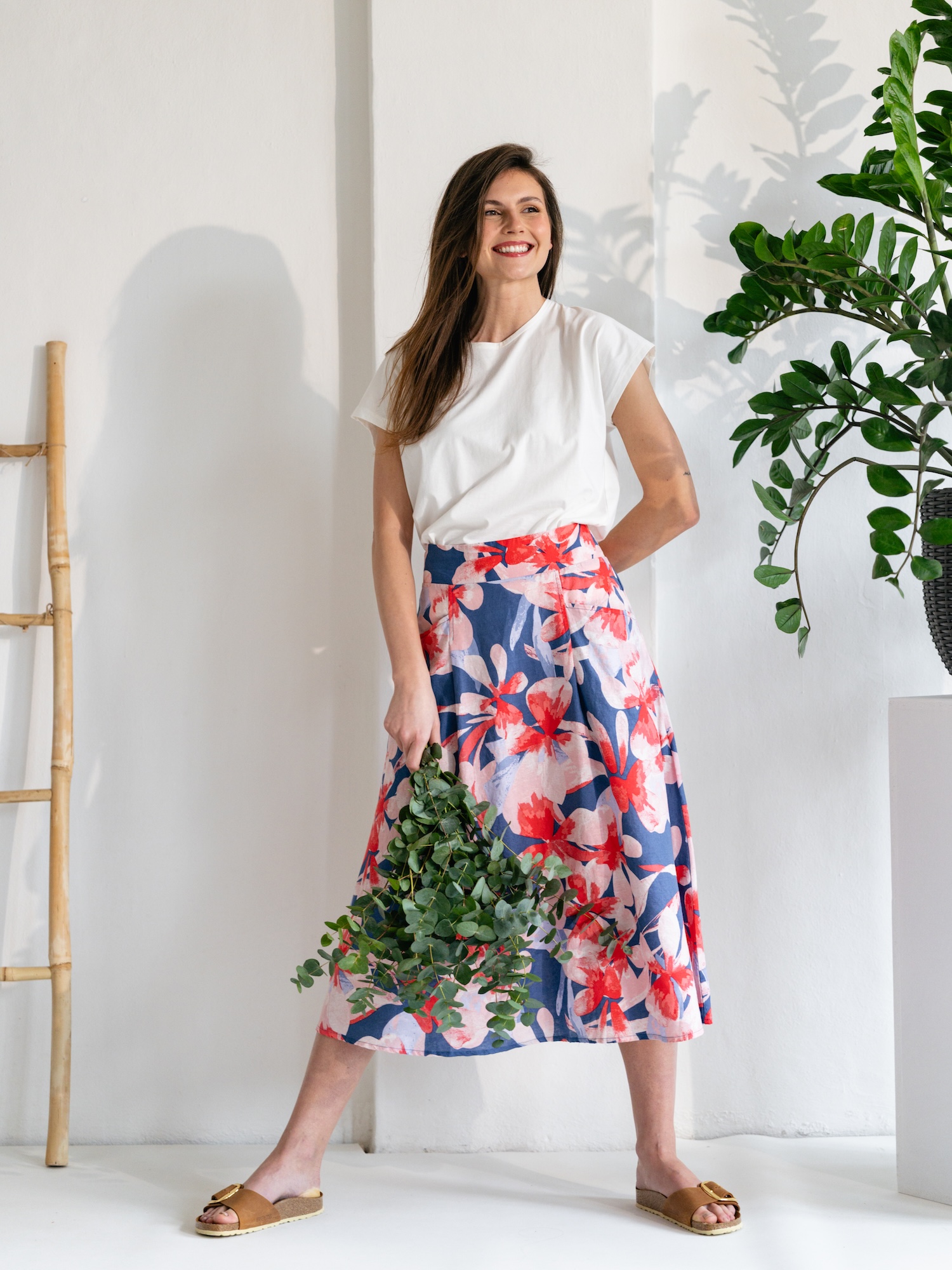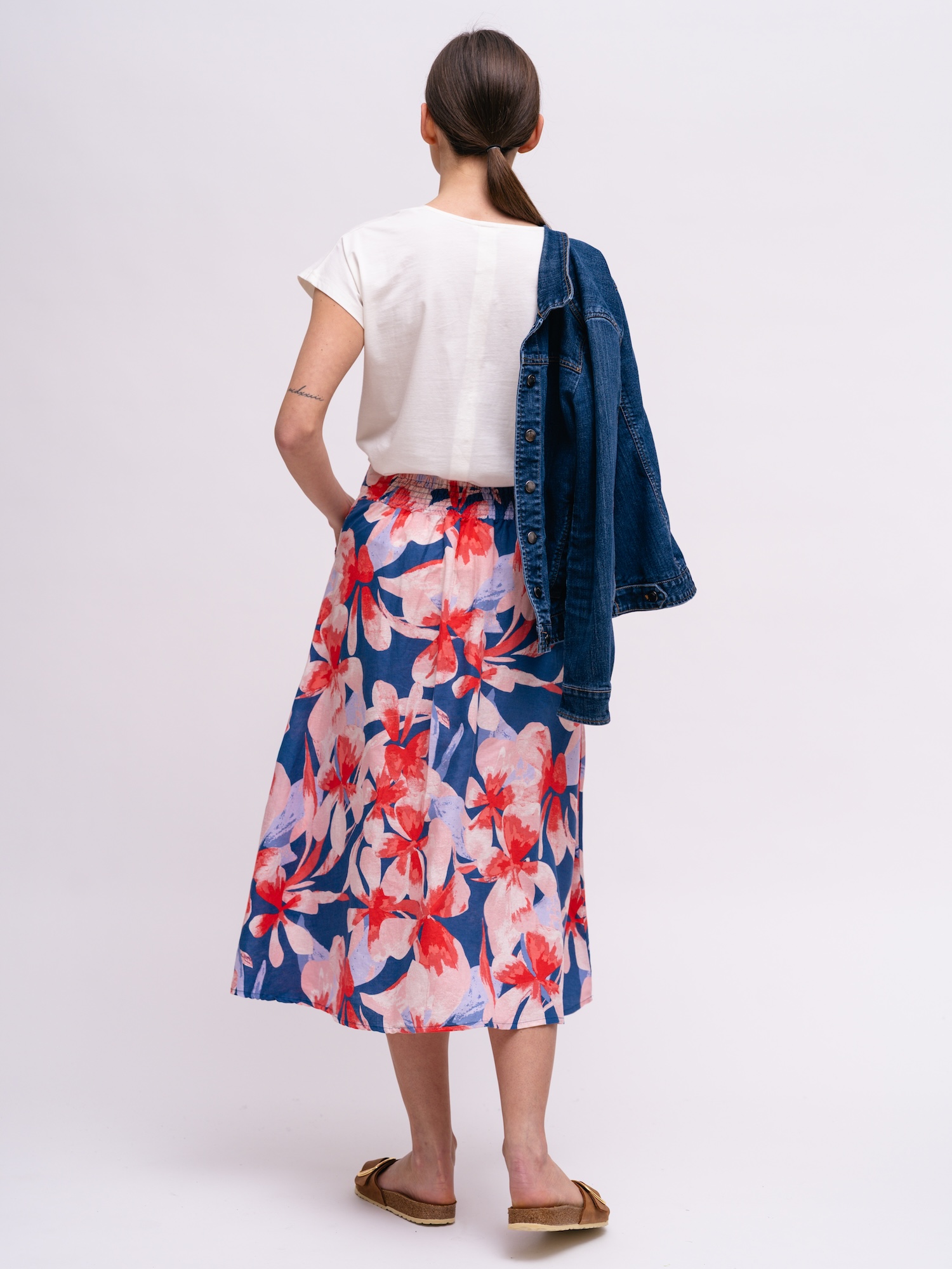 Für einen Spaziergang oder einen Brunch eignet sich der geblümte Midirock im sanften A-Linien-Schnitt. Der farbenfrohe Print auf der Leinen-Baumwoll-Mischung setzt einen natürlichen, ausdrucksstarken Akzent.