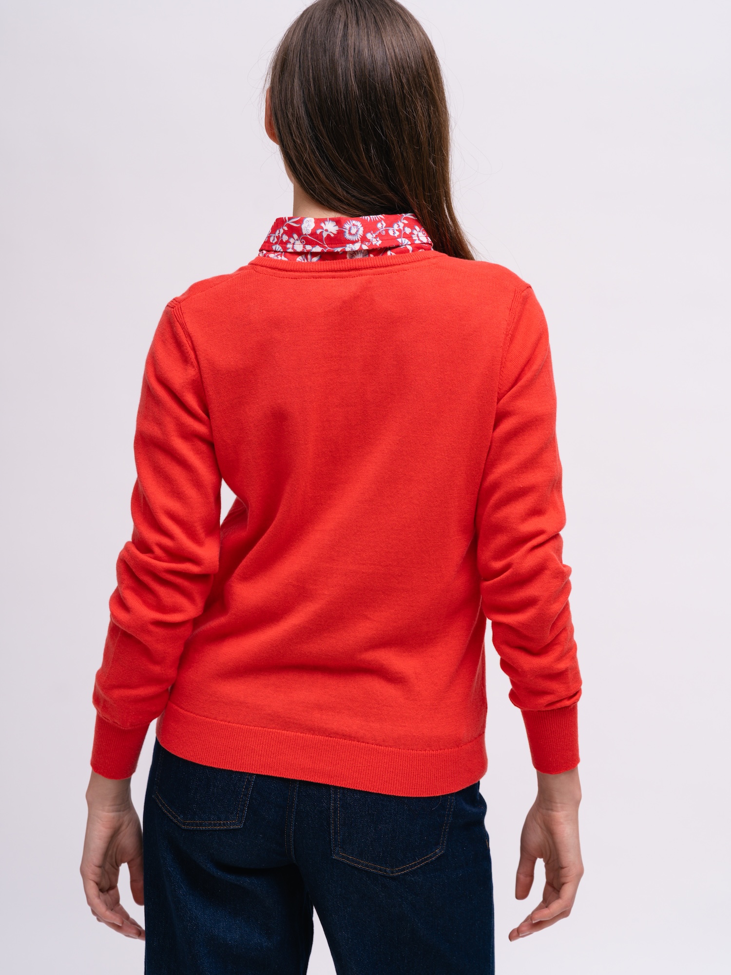 Eine kräftig rote Strickjacke mit Rundhalsausschnitt belebt jedes Outfit. Der gerade Schnitt passt über Blusen und dünnere Pullover.