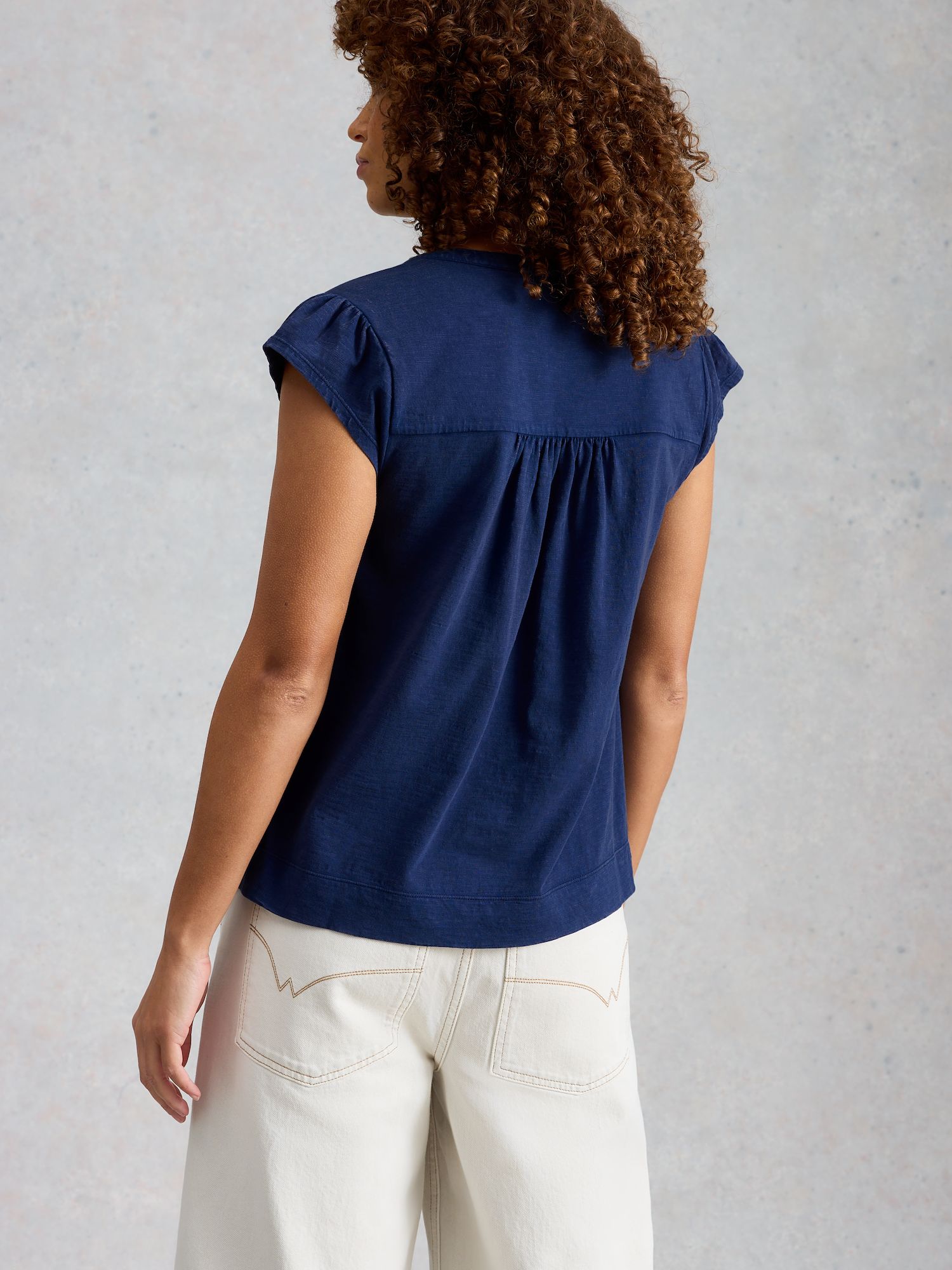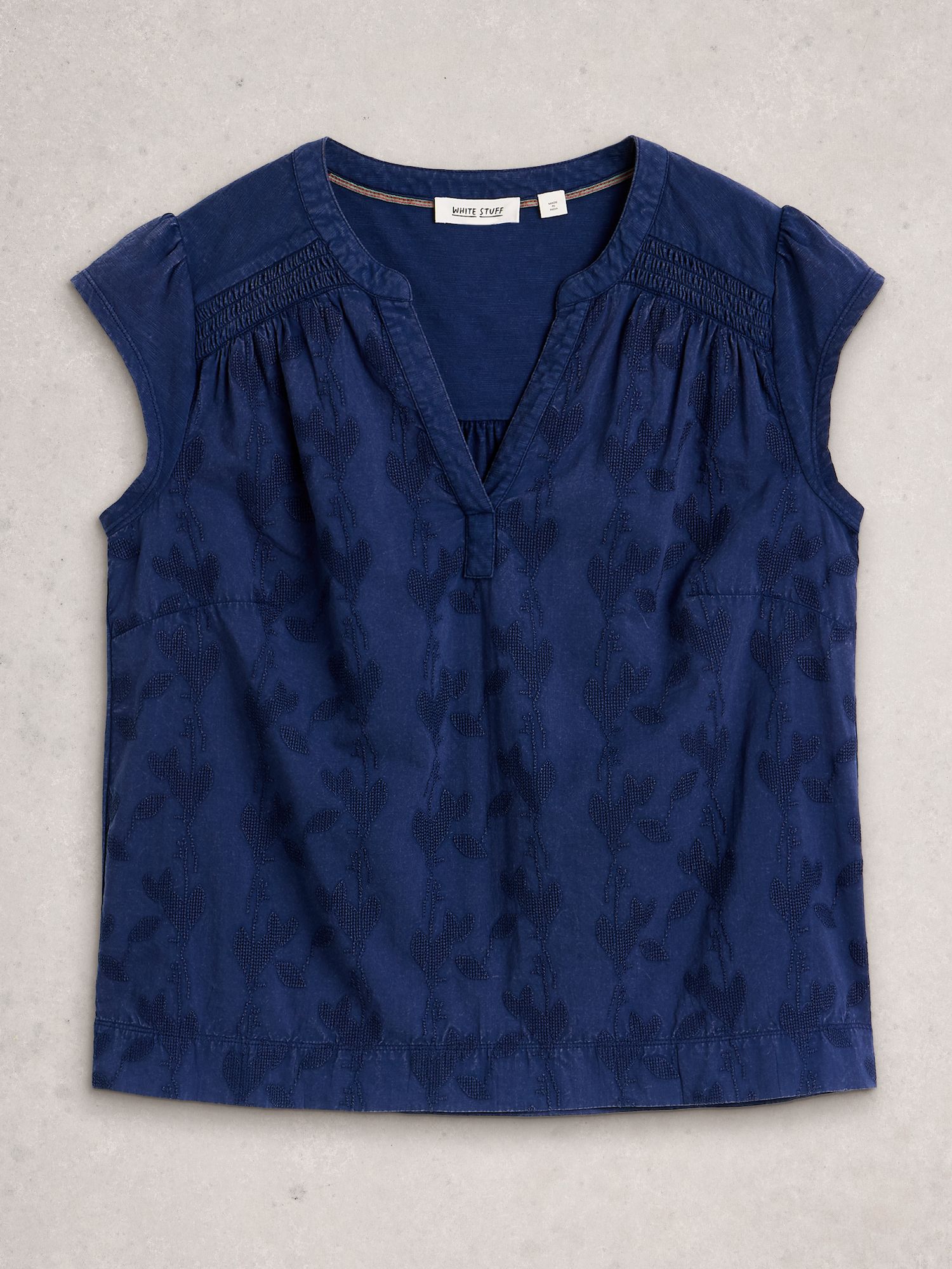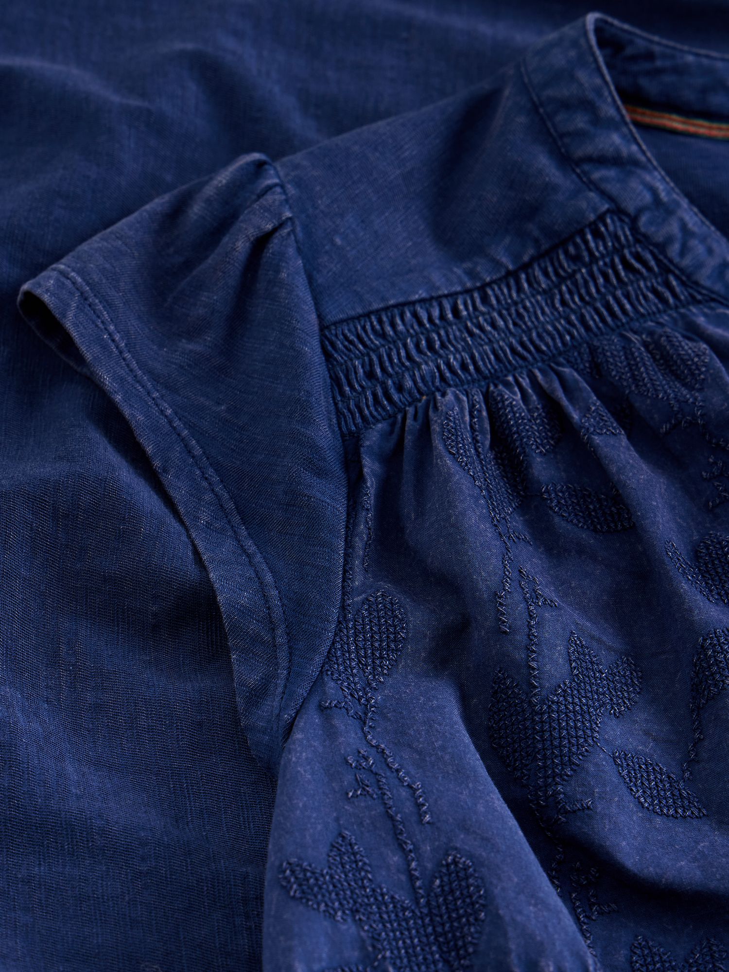 Dieses Top aus Bio-Baumwolle präsentiert sich in tiefem Indigo mit feiner Stickerei. Der gerade Schnitt und die leichte Elastizität sorgen für angenehmen Tragekomfort.