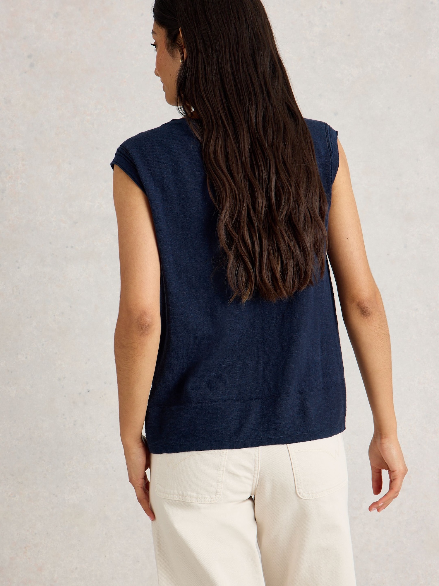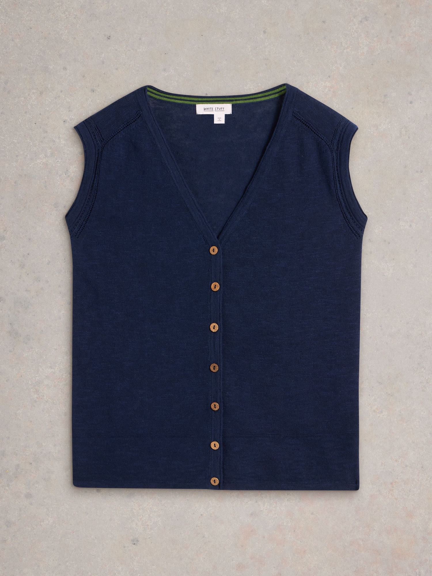 Leichte Strickweste mit V-Ausschnitt für einen klaren, modernen Look. Sie lässt sich praktisch über Shirt oder Bluse tragen, ideal fürs Büro und für den Stadtbummel.